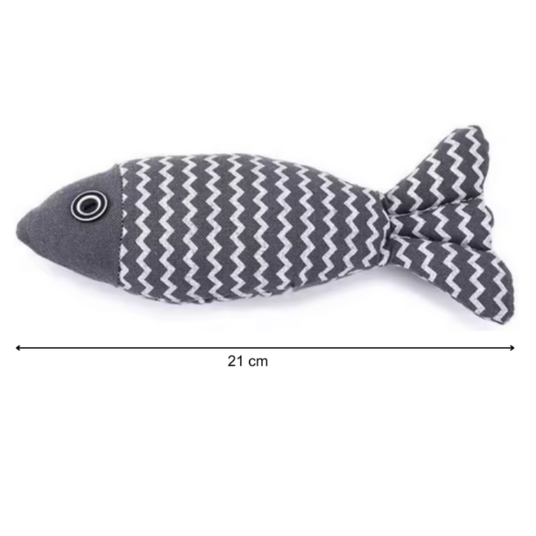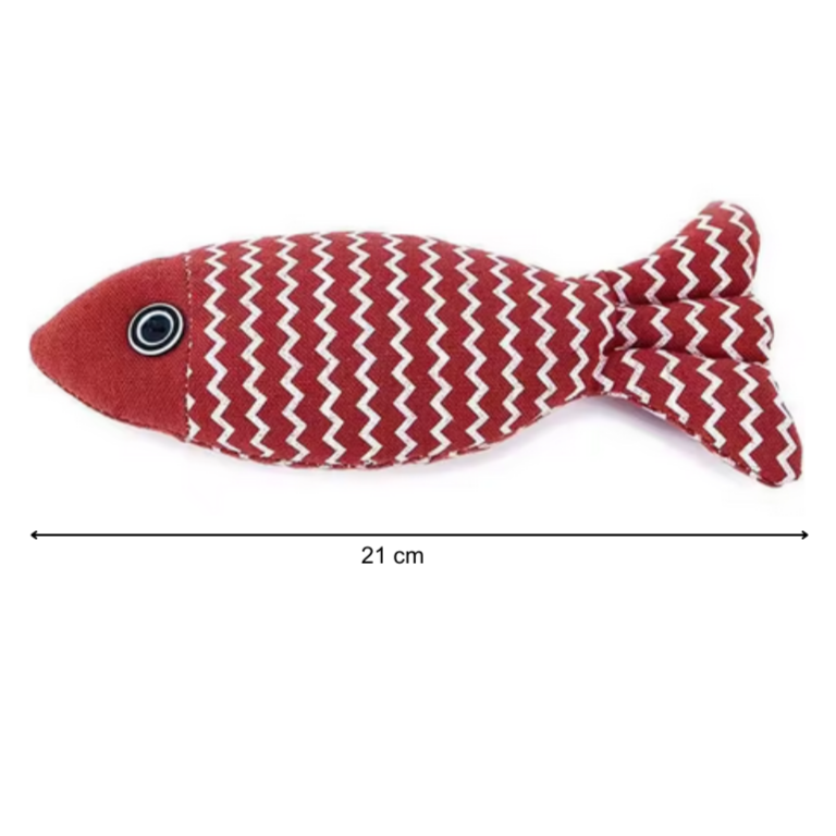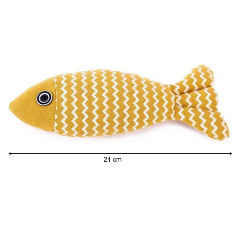 Das Spielzeug besteht aus robustem Leinen mit Baumwollfüllung und ist in Form eines bunten Fisches gestaltet. Die Katze kann es treten, jagen, beißen oder einfach mit ihm kuscheln. Die kräftigen Farben und die strukturierte Oberfläche machen es besonders attraktiv.